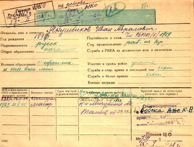 - с 29 февраля 1940 года – начальник Мичуринского аэроклуба Тамбовского областного совета Осоавиахима.