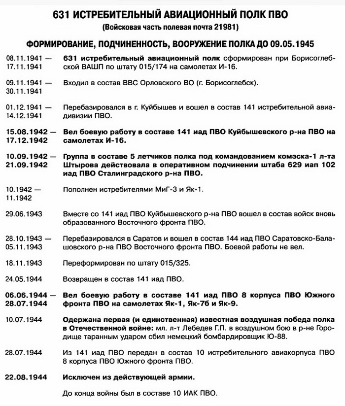 С 15.08.1942 полк вступил в боевые действия в составе 141-й иад ПВО Куйбышевского района ПВО. Подполковник Боровский Г.С. командовал 631-м иап до 18.04.1944.