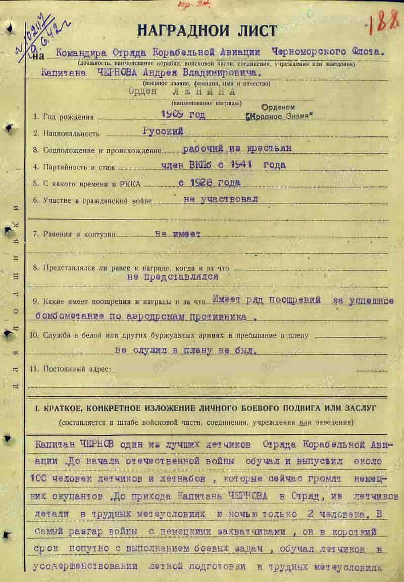 09.06.1942 командир отряда корабельной авиации эскадры ЧФ капитан Чернов А.В. представлен к награждению орденом Ленина. 09.12.1942 награждён орденом Красного Знамени.