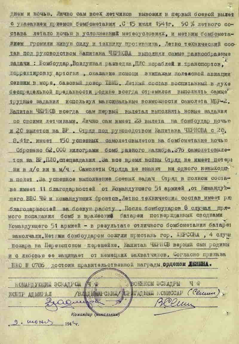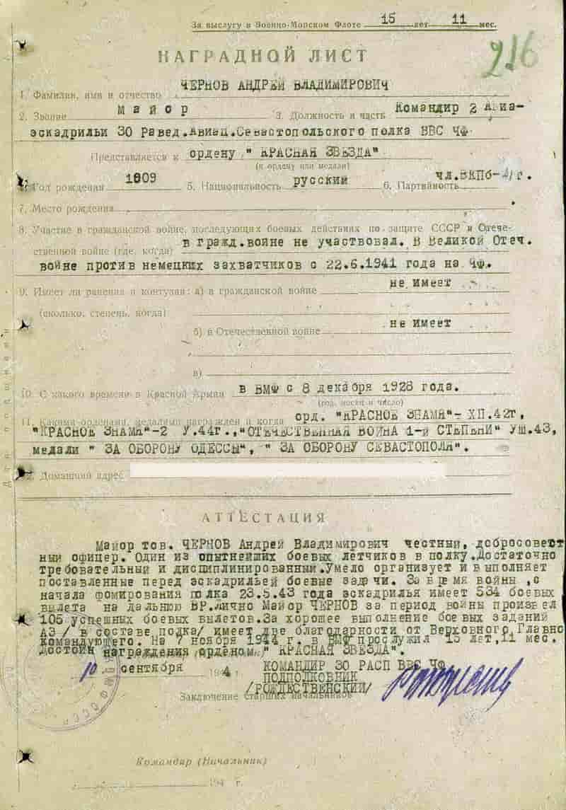 10.09.1944 командир 2-й аэ 30 рап ВВС ЧФ майор Чернов А.В. представлен к награде.
