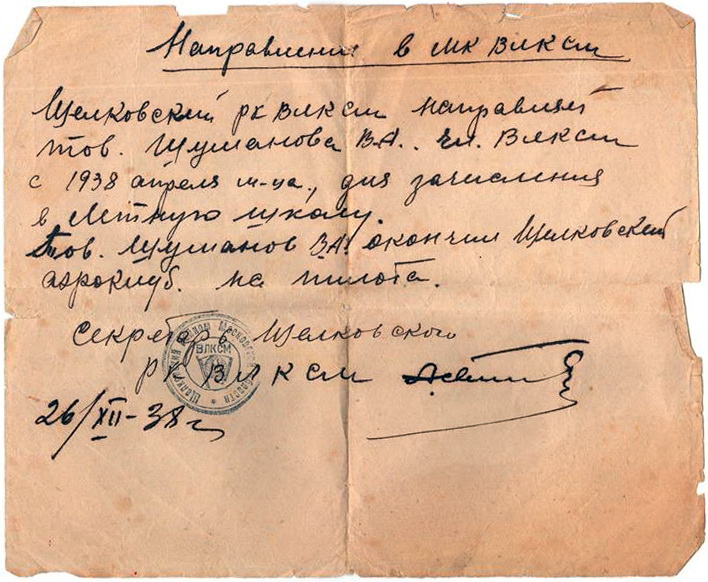 Аэроклуб окончил в 1938 году и был рекомендован для зачисления в лётное училище. В то время зачисление в училище обязательно производили по рекомендации МК ВЛКСМ. И вот Щёлковский РК ВЛКСМ даёт ему рекомендацию в МК ВЛКСМ для зачисления в лётную школу.