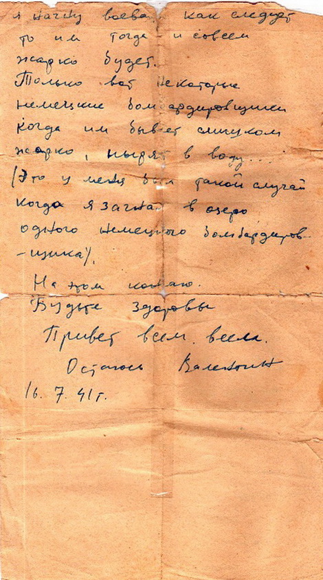 Войну встретил в составе 159 авиационного полка 38 авиационной дивизии, расквартированной на станции ДНО недалеко от Ленинграда. Сразу же начались боевые вылеты, настолько интенсивные, что уже в июле группе лётчиков дали кратковременный отдых. Своё последнее письмо он написал 16 июля 1941 года, текст письма по-мальчишески задирист и оптимистичен.