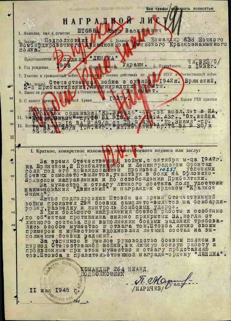 11.05.1945 командир 638 нбап подполковник Штовба К.В. представлен к награде.