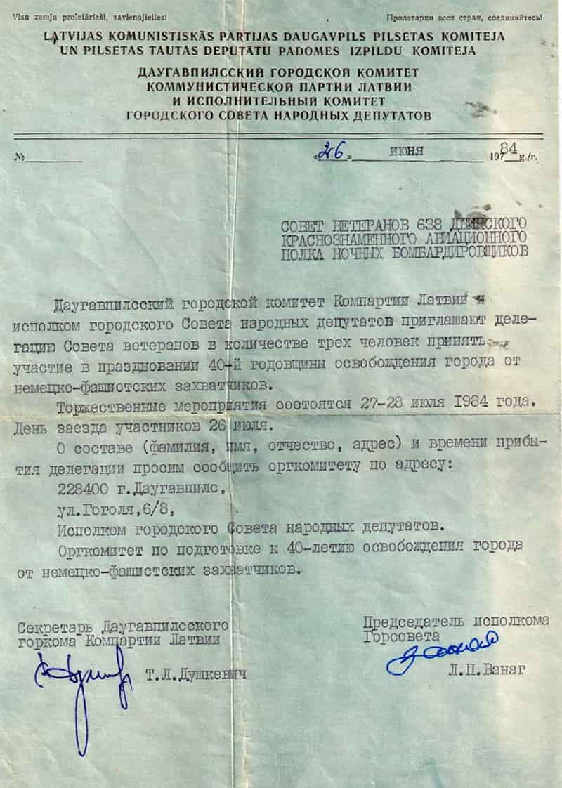 Командир 638 нбап подполковник Штовба К.В., начальник штаба майор Какаций Алексей Никифорович и представители полка Михно Д., Заец Н., Свинкин Л. участвовали в Параде Победы на Красной площади в 1945 году.