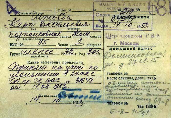 С 14.10.1953 поставлен на учёт в Щербаковском ВК г. Москвы. Проживал в г. Москве по адесу ул Домниковская д. 27 кв. 15.