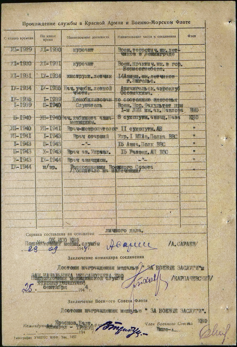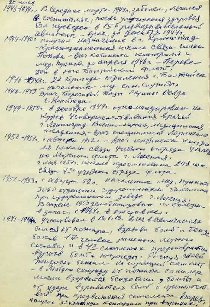 На ноябрь 1944 года - военный врач в Краснознамённом Балтийском флоте, капитан медицинской службы.