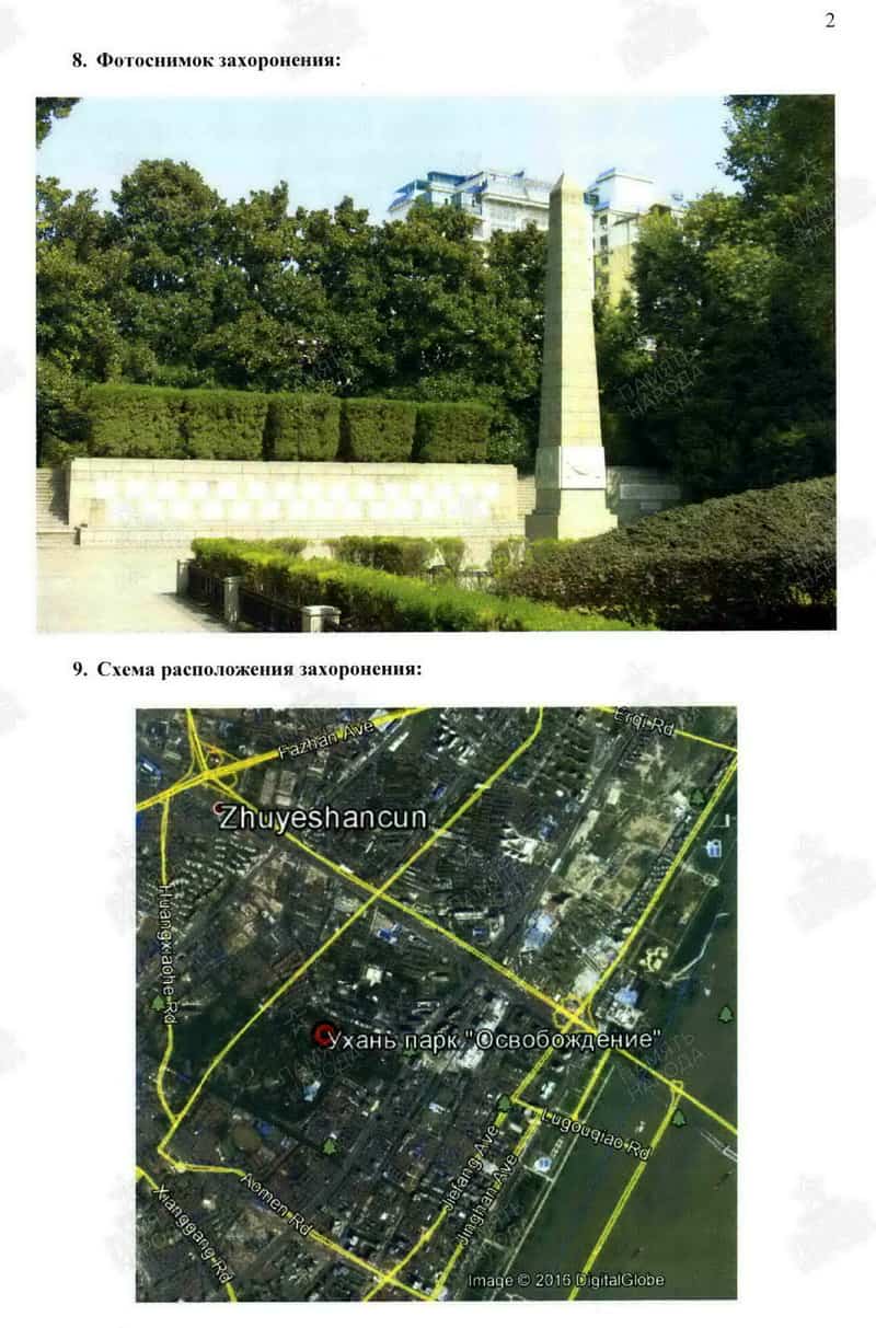 Изначально был захоронен в Ханькоу на кладбище «Ваньго» (теперь часть г. Ухань). Потом в 1956 году сделали перезахоронение в парке «Освобождение» и увековечили имена 15 лётчиков, которых идентифицировали - установили таблички. Впоследствии в 2015 были дополнены ещё 14 лётчиков. А уже потом имена всех 29 погибших лётчиков - на мемориале в Нанкине.