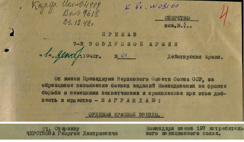 За этот и другие бои командир звена 197 иап старшина Георгий Черствов был награждён орденом Красной Звезды.