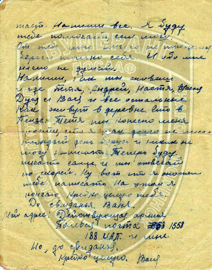 Сегодня этой заметкой я хочу отдать дань память пилоту 188 иап 77 сад старшине Сорокину Ивану Петровичу, который отдал свою молодую жизнь за нас. Иван Петрович, мы постараемся тебя найти! Также публикую его фотографию и последнее письмо. Вечная тебе память!