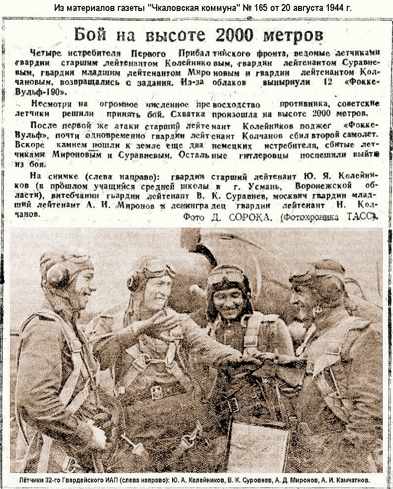 Лётчики 32-го гвиап, слева направо. 1-й ряд: В.А. Орехов, В.А. Савельев, С.Ф. Долгушин, Ю.Я. Келейников;