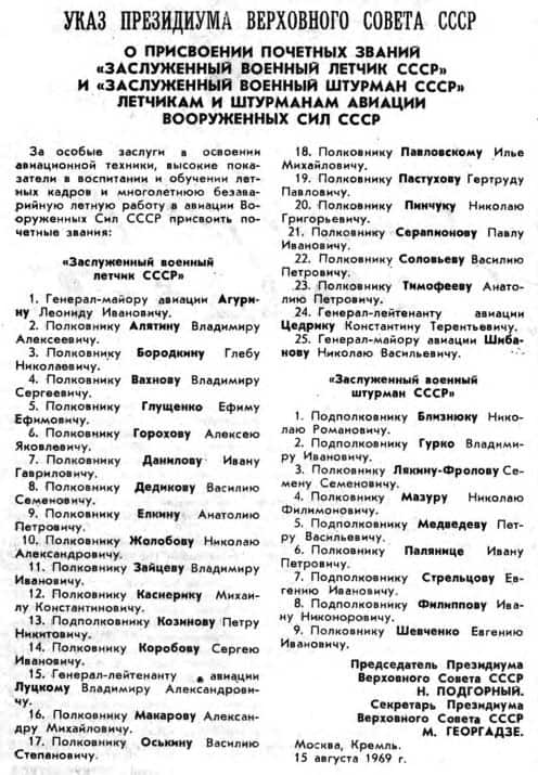 Присвоено звание "Заслуженный военный лётчик СССР" - Указ Президиума ВС СССР № 316 от 15.08.1969.