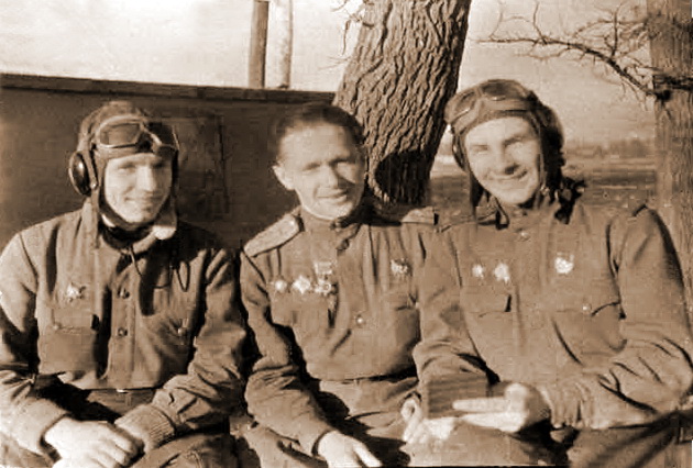 Слева направо: Корнеев, Колесников, Данилов. Ноябрь 1944 г. Фото из музея 927-й истребительной авиационной базы.