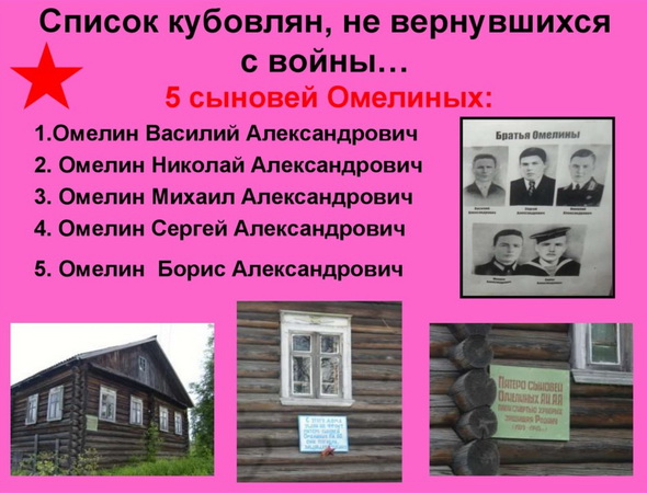 На берегу Водлы в деревне Кубово стоит дом Омелиных. Пятерых сыновей отправили на фронт Александр Иванович и Акулина Александровна. И никто из них не вернулся домой...