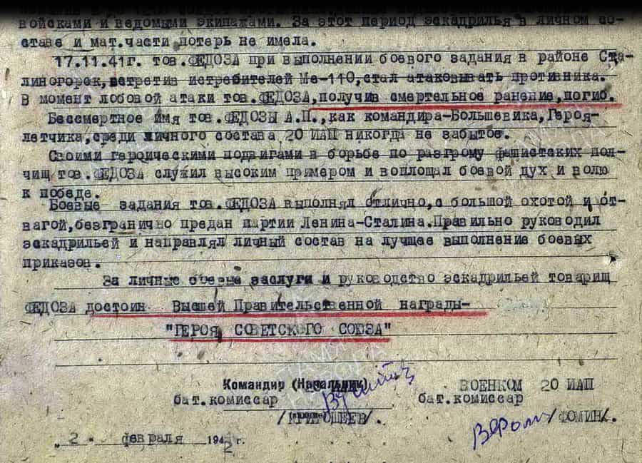 17 ноября 1941 года командир эскадрильи 20 иап старший лейтенант Федоза Александр Порфирьевич на самолете Як-1 погиб в воздушном бою в районе Сталиногорска. Встретив истребители противника Ме-110, приступил к атаке противник и в момент лобовой атаки получил смертельное ранение.