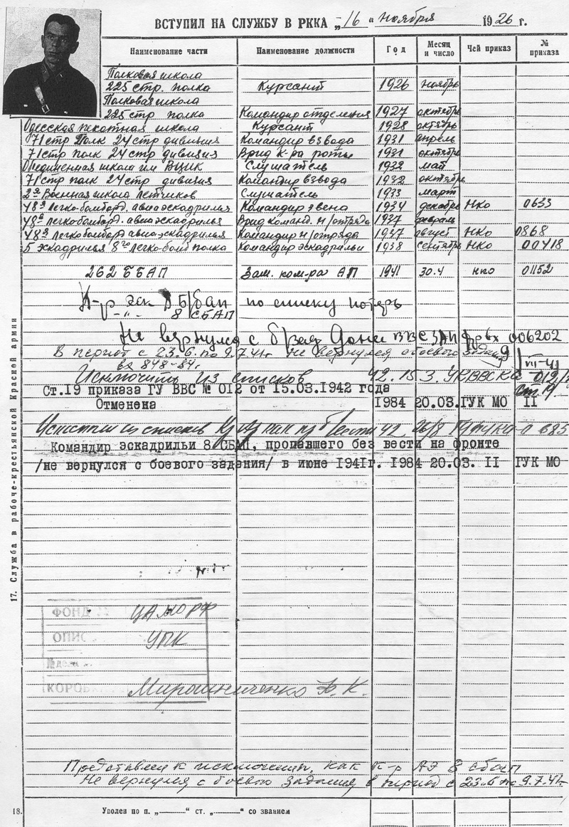 Командир эскадрильи 8-го легкобомбардировочного полка Западного фронта капитан Мирошниченко Филипп Кондратьевич погиб 23.06.1941. Изначально числился пропавшим без вести.