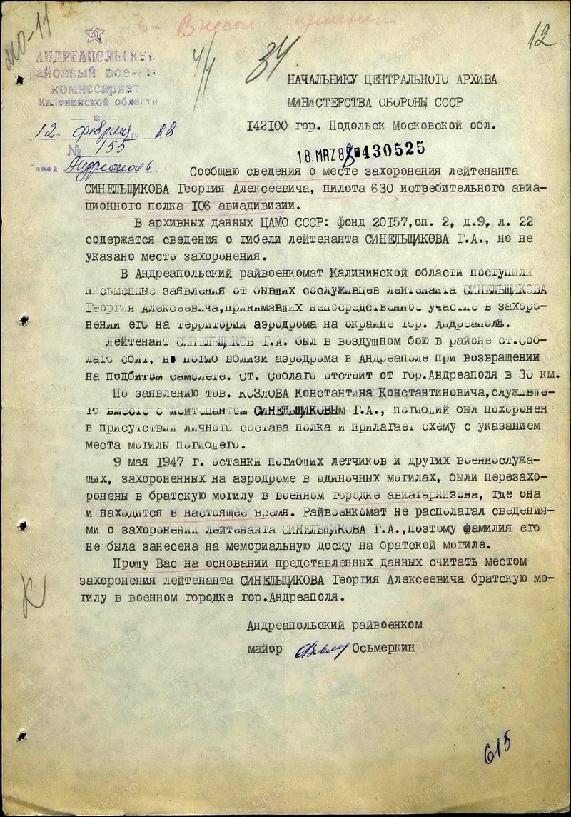 От Администратора сайта. Интересен факт, что в представлении к присвоению звания Героя Советского Союза отмечено, что "...В прошлом лейтенант Синельщиков за допущенные по своей вине три аварии самолётов был осуждён военным трибуналом на 10 лет тюремного заключения с оставлением в действующей армии с тем, чтобы последующей честной боевой работой искупил свою вину перед Родиной...". Вероятно, данное обстоятельство не позволило командующему иа ПВО территории страны генерал-майору Осипенко утвердить представление.