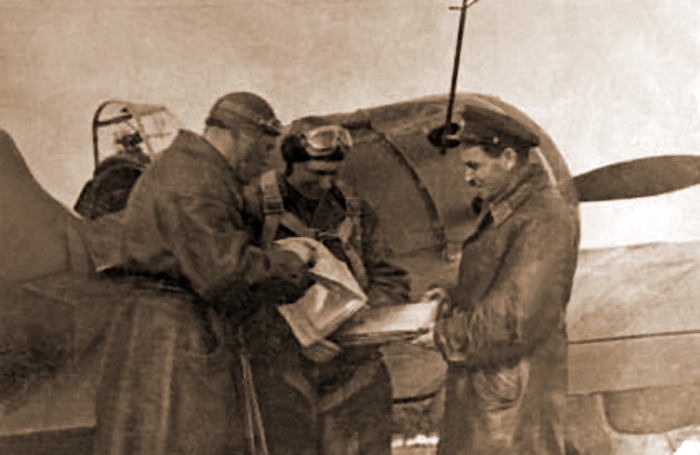 В центре: командир 3-го гвардейского истребительного авиаполка Шпак Даниил Савельевич. Справа: его заместитель по лётной части Кушпан. Слева: комиссар полка Аллахвёрдов Г.И. 1941 год, аэродром Бесовец.
