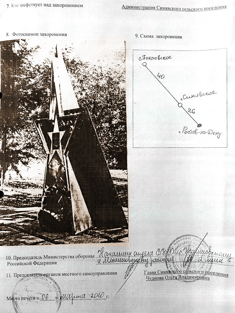 Место захоронения: Ростовская область, Неклиновский район, с. Синявское, центр, Буденовский спуск, братская могила. На месте захоронения в августе 1983 года установлен обелиск.