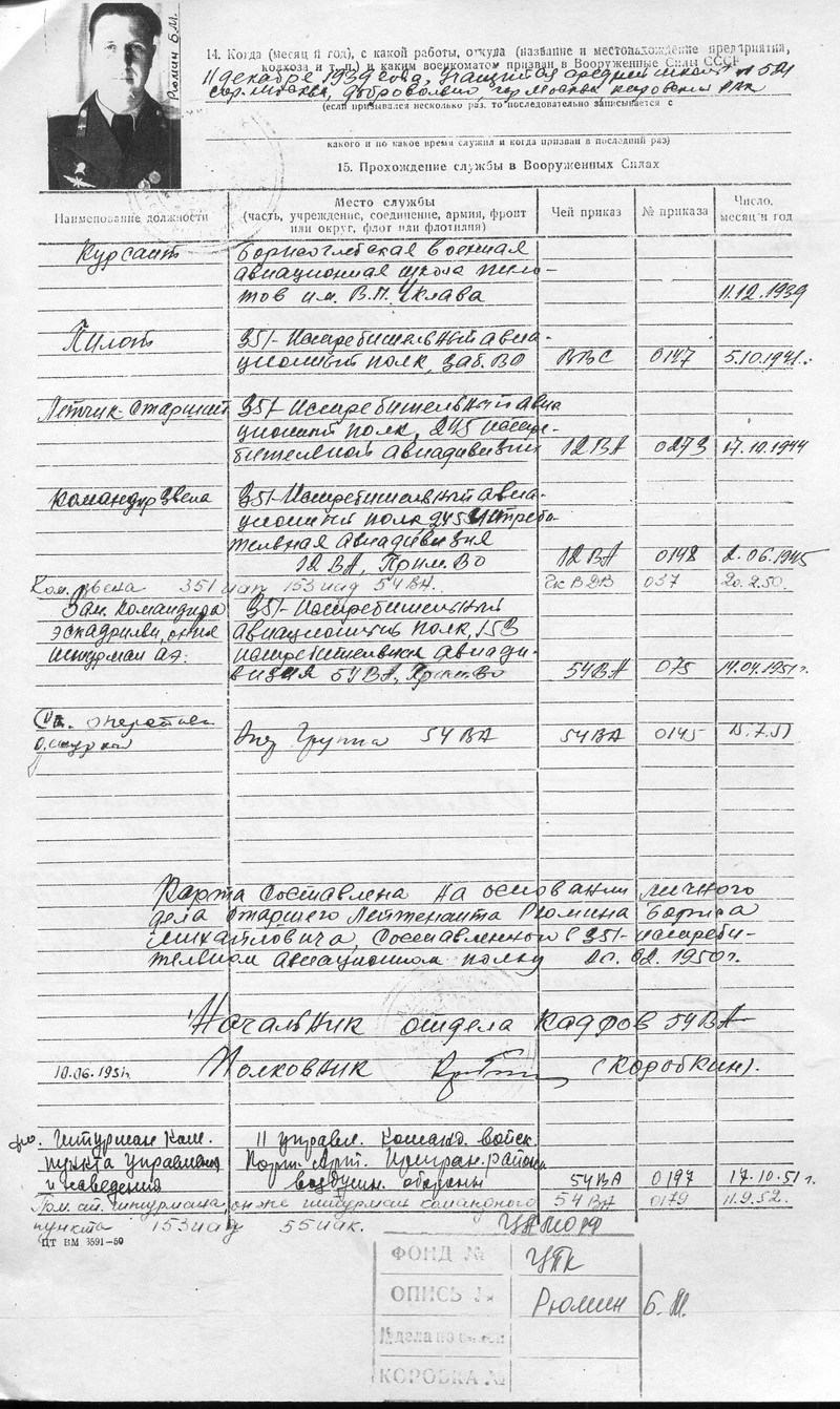 В Красной Армии с 11.12.1939. Призван Кировским РВК Московской области. Добровольно поступил в Борисоглебскую ВШЛ. Летал в 4 аэ.