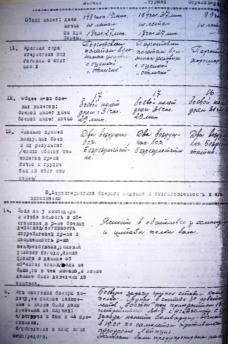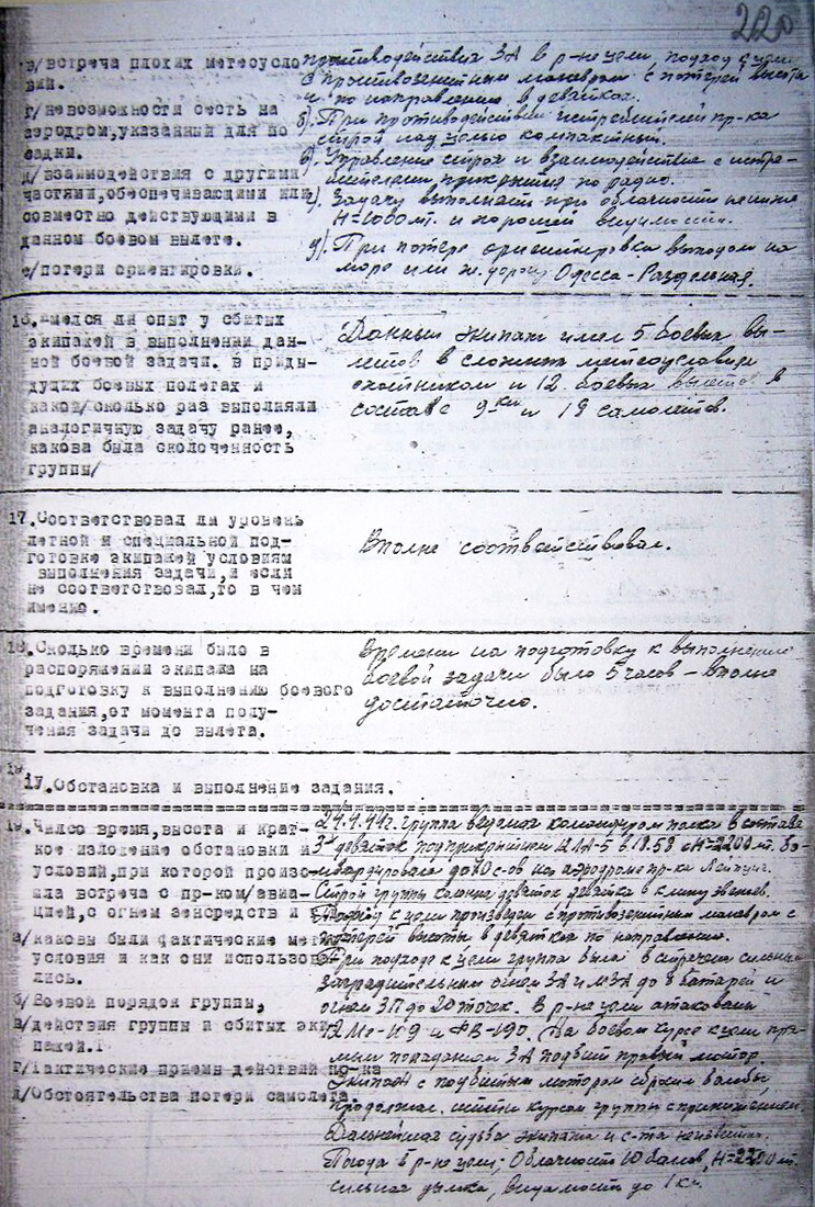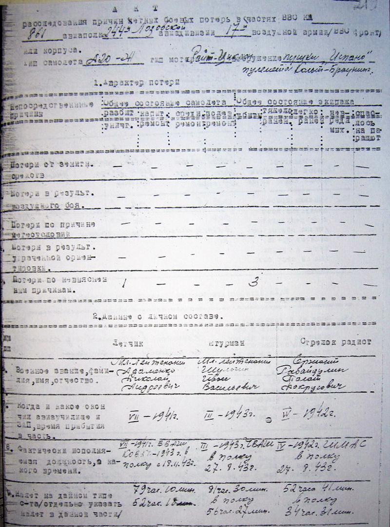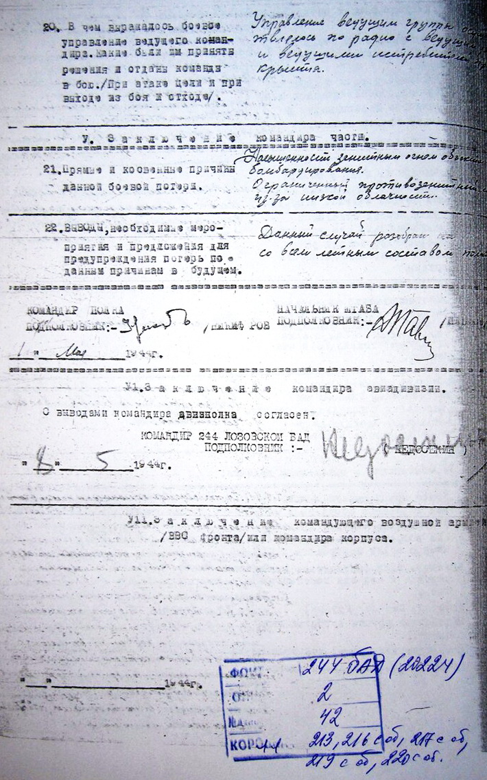 Из акта расследования: "...Боевую задачу группе ставил командир полка. Группа в составе трёх девяток (три эскадрильи) самолётов Бостон под прикрытием 18-25 истребителей Ла-5 нанесли бомбардировочный удар по самолётам противника на аэродроме Лейпциг (посёлок Серпневое Тарутинский район Одесская область). На боевом курсе к цели, прямым попаданием зенитной артиллерии противника был подбит правый мотор. Экипаж с подбитым мотором сбросил бомбы и продолжал идти курсом группы со снижением..."