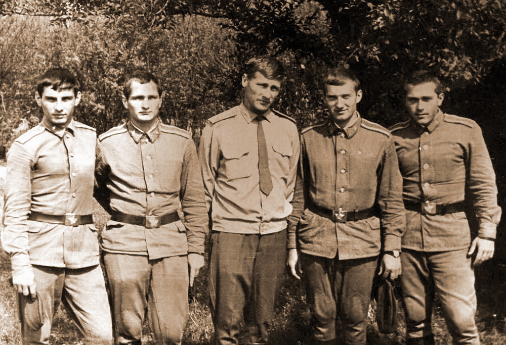 Поворино, июль 1973 г. Бахал Иван, Захаров Владимир, инструктор Голубев Александр Николаевич, Красовский Евгений, Дорофеев Григорий. Из фотоальбома Симкина Юрия Васильевича, выпускника 1974 года.