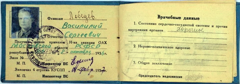 1940-1941 гг. - старший лётчик-инструктор 10-го отдела 1-го управления Главного управления ВВС Красной Армии;