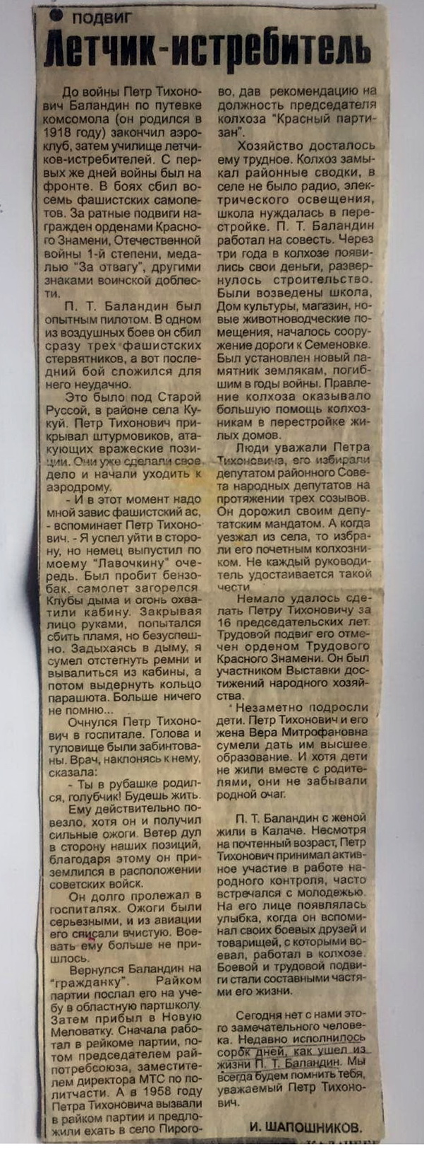 Баландин Пётр Тихонович умер 27 августа 2002 года.