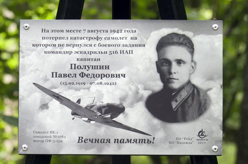 По найденным, в разное время, номерам самолета и мотора поисковикам удалось установить, что 7 августа 1942 года, на самолете ЯК-1, с боевого задания не вернулся командир эскадрильи 516 ИАП капитан Павел Федорович Полушин. Останков летчика и личных вещей на месте обнаружено не было.