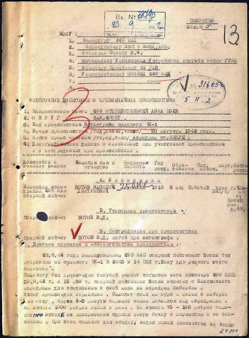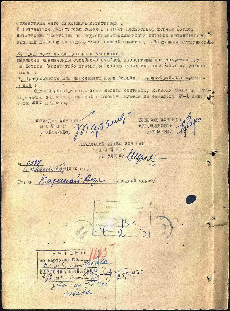 Командир эскадрильи 298 иап 229 иад старший лейтенант Зотов Василий Дмитриевич погиб 30 августа 1942 года в авиакатастрофе.
