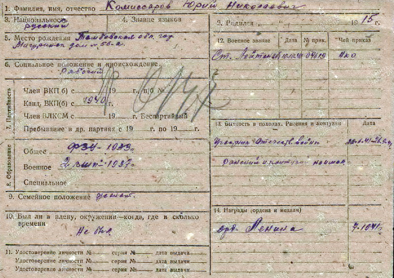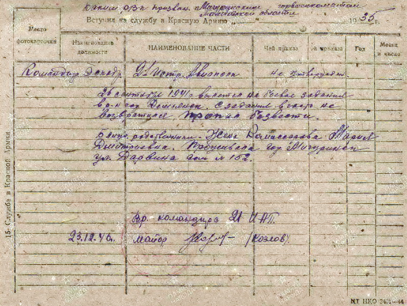 Жена Комиссарова Мария Дмитриевна на момент гибели мужа проживала в г. Мичуринске по адресу ул. Дарвина дом 152.