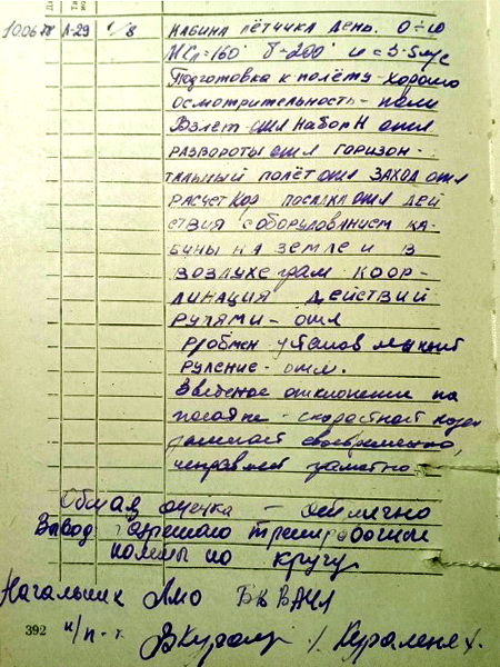 10.06.1978, полевой аэродром Староюрьво. Допуск курсанта Сигаева В.А. к первому самостоятельному полёту по кругу на самолёте Л-29. Проверяющий - начальник ЛМО Борисоглебского ВВАУЛ подполковник Кураленя: