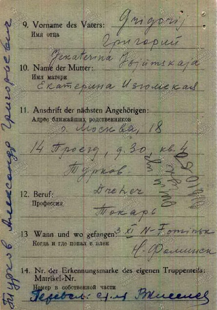 Жена Туркова Александра Николаевна проживала в г. Москве по адресу 14 -й проезд Марьиной Рощи дом 30 (совместно с матерью Александра и отцом Турковым Григорием Кузьмичем).