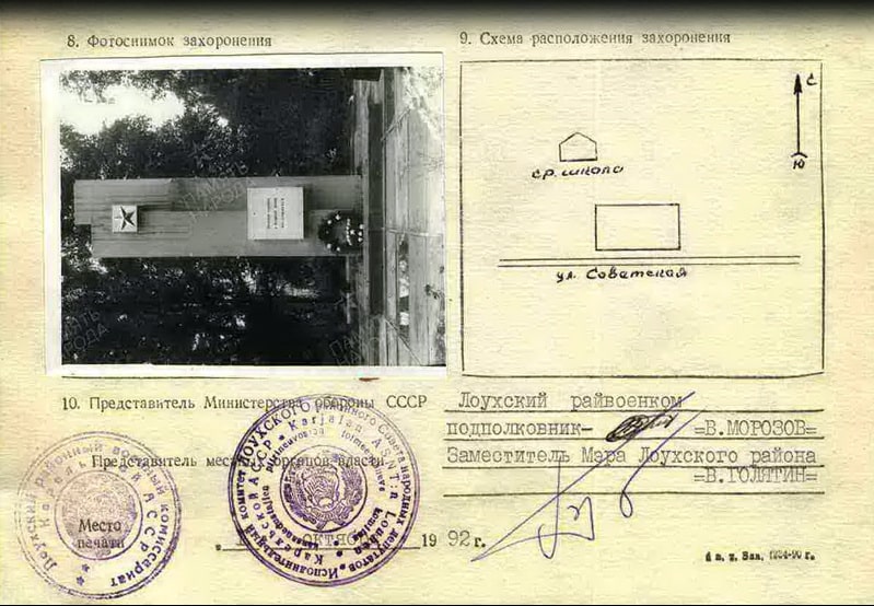 Первичное место захоронения Карело-Финская ССР, Лоухский район, станция Лоухи. Перезахоронен в братскую могилу пгт Лоухи.