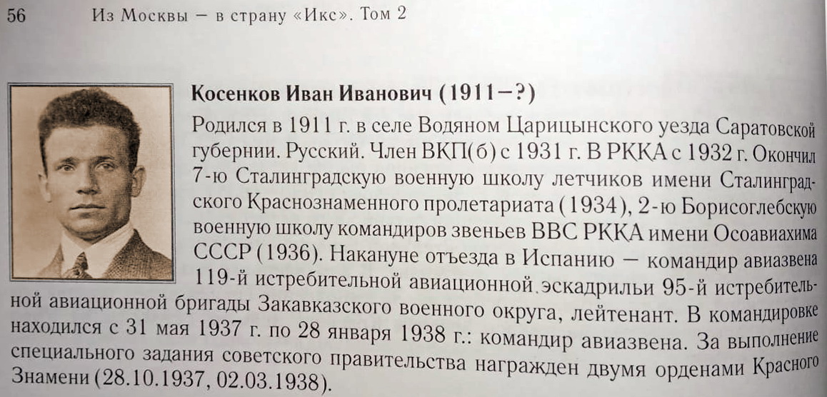 Лейтенант Косенков выполнил в Испании около 150 боевых вылетов и имел 180 часов боевого налёта.