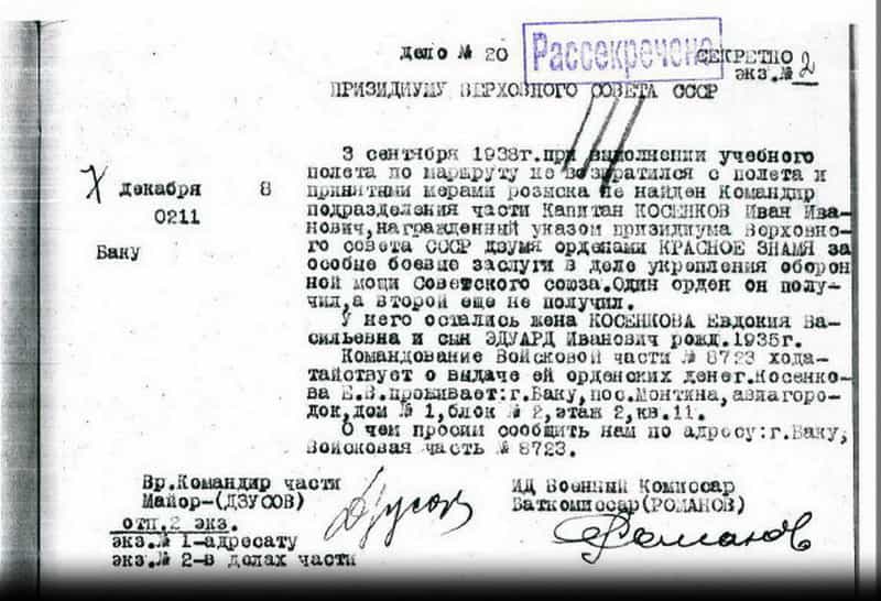 Из документа можно сделать вывод, что Косенков И.И. при выполнении учебного полёта погиб. Однако в последующих документах есть сведения о дальнейшем продолжении им службы.