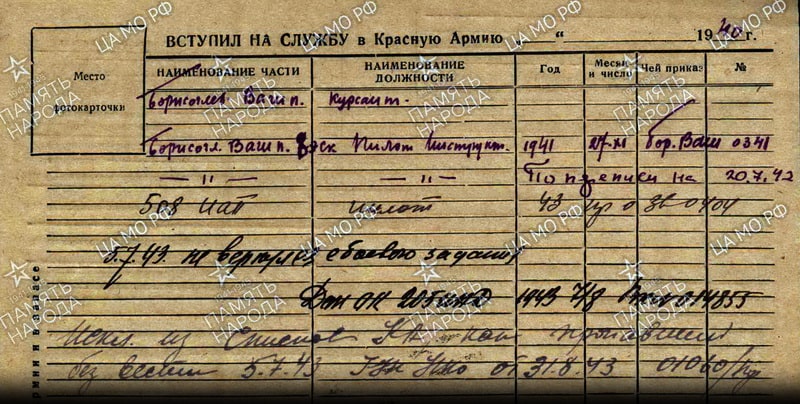 После выпуска назначен пилотом-инструктором 8 эскадрильи Борисоглебской ВАШП Число, месяц и год рождения: 1922 До поступления в ВШЛ проживал:: Мордовская АССР, Ромадановский район, село Пушкино