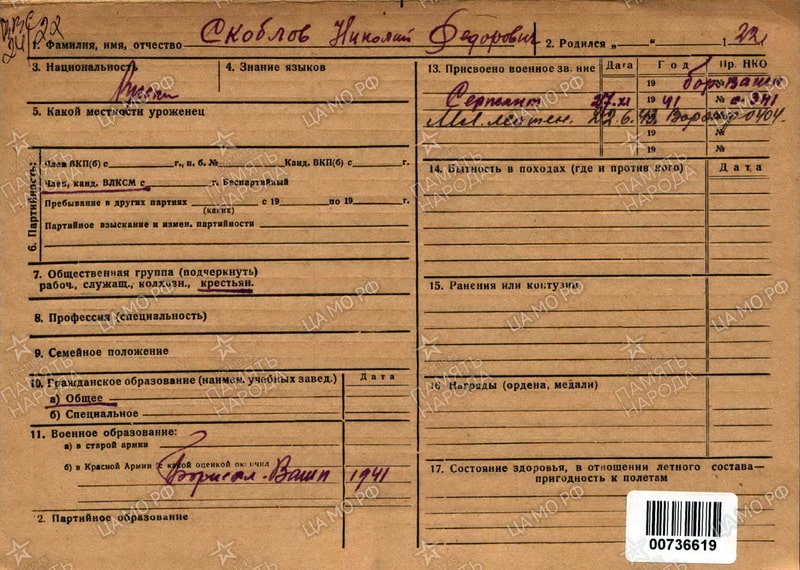 Имя: Скоблов Николай Фёдорович Год выпуска, рота, классное отделение: Приказ N 0341 от 27.11.1941 Борисоглебская ВАШП. Присвоено звание сержант