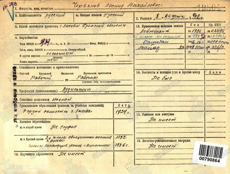 Жена Червякова Нина Ивановна на момент гибели мужа проживала в городе Красноярске, военный городок корпус 217 кв. 3 (в другом источнике в г. Вольске Саратовской области по адресу ул. Толстого дом 107).