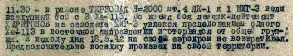Лётчик 148 истребительного авиационного полка Юго-западного фронта лейтенант Харитонов Александр Степанович погиб 18 мая 1942 года - пропал без вести.