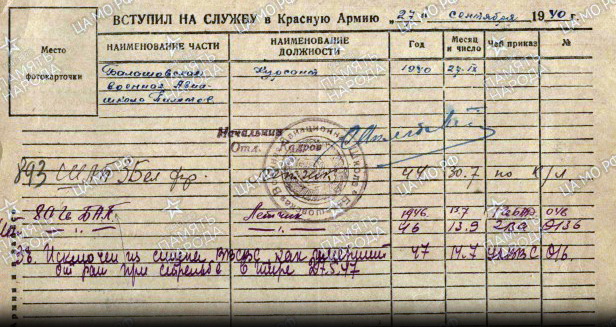 "...Участник Отечественной войны с июня 1944 года. Участвуя в наступательной операции 3-го Белорусского фронта при прорыве обороны противника на Оршанско-Витебском направлении, уничтожении окружённой вражеской группировки противника южнее г. Витебск и преследовании отходящих частей противника, а затем на 1-м Украинском фронте, совершил 16 успешных боевых вылетов, за что награждён правительственной наградой - орденом "Красная Звезда".