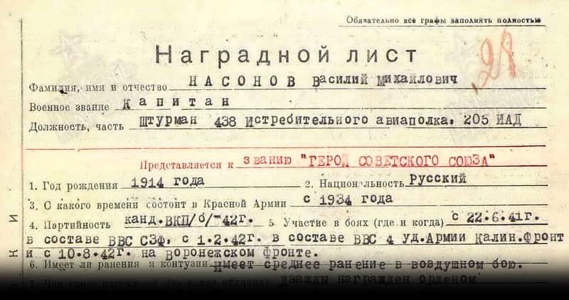 Из воспоминаний Василия Насонова: "...В конце 1943 года меня направили на учёбу в академию ВВС в п. Монино, где учился по 1947 год. После окончания академии был направлен командиром полка в Туркестанский ВО, в г. Ашхабад, где служил до конца 1948 года. Затем был переведён в г. Москву в штаб ВВС старшим инспектором. В 1954 году назначен командиром дивизии опять же в Туркестанский ВО. За безупречную службу и отличные показатели дивизии мне в 1958 году было присвоено звание генерал-майор авиации. В 1958 году был направлен в город Астрахань для организации полигона по испытанию и запуску отечественных ракет. Был назначен начальником Прикаспийской учебной авиационной базы. В 1962 году по состоянию здоровья был уволен в запас."