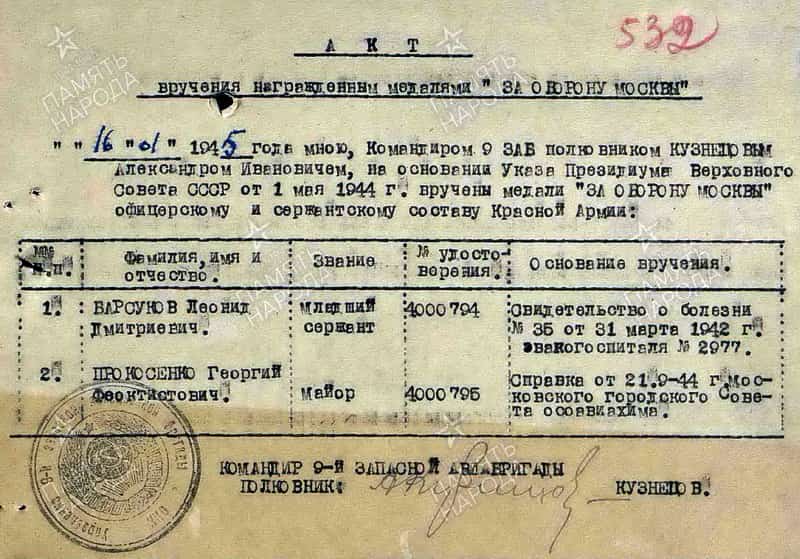 Места службы: в 1945 году - 9 забр, Мосгорсовет ОСОАВИАХИМ, майор.