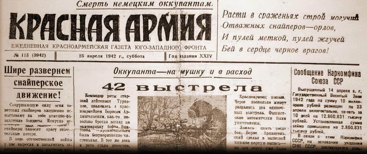 Фронтовая газета с материалом о снайпере Б.К. Архангельском.25.04.1942