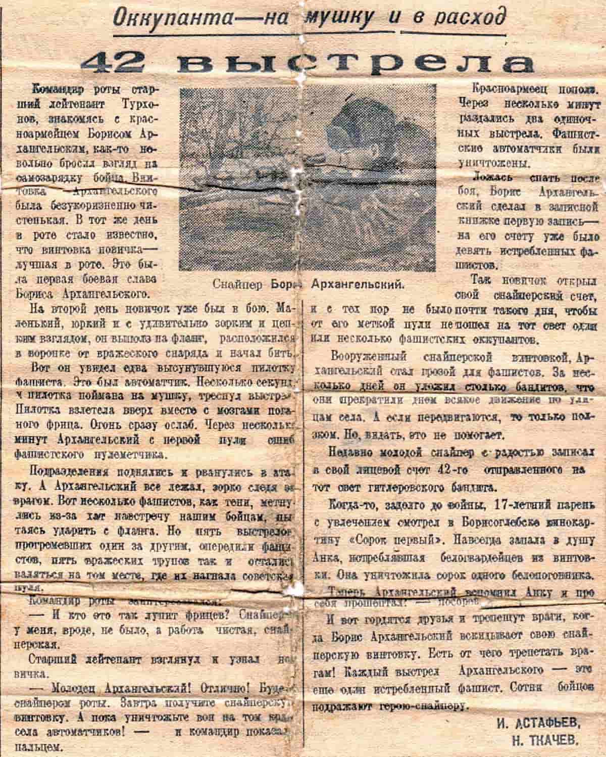 «...Весной 1942 года в печати появилось имя второго героя – борисоглебца Бориса Архангельского. Сначала о нем сообщала фронтовая газета «Красная Армия». Она сообщала, что Борис Архангельский с первого дня пребывания на фронте обратил на себя внимание командира роты старшего лейтенанта Турхонова своей меткой стрельбой. Автор статьи пишет, что успех Б. Архангельскому принесли его хладнокровие, находчивость и зоркий глаз. «...Вот он увидел едва высунувшуюся пилотку фашиста. Это был автоматчик. Несколько секунд – и пилотка поймана на мушку, треснул выстрел. Пилотка взлетела вверх вместе с мозгами поганого фрица.