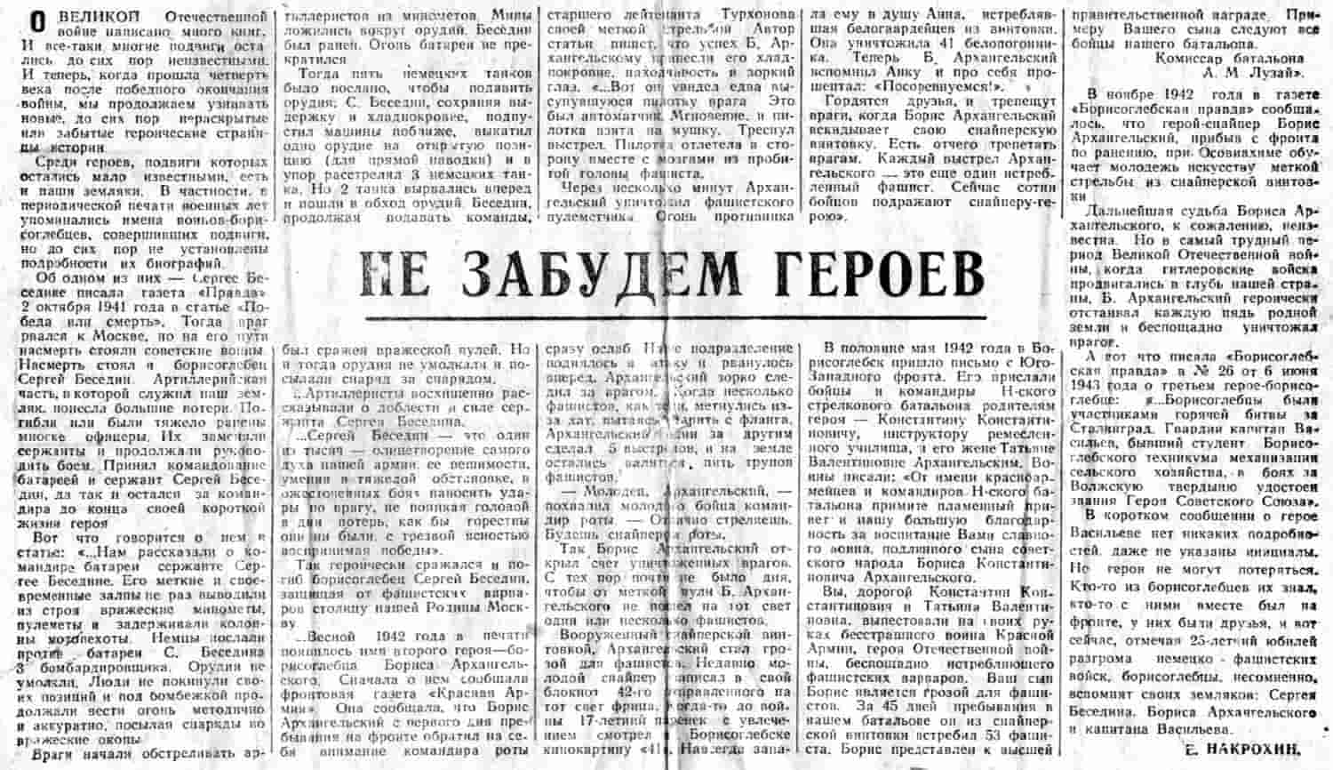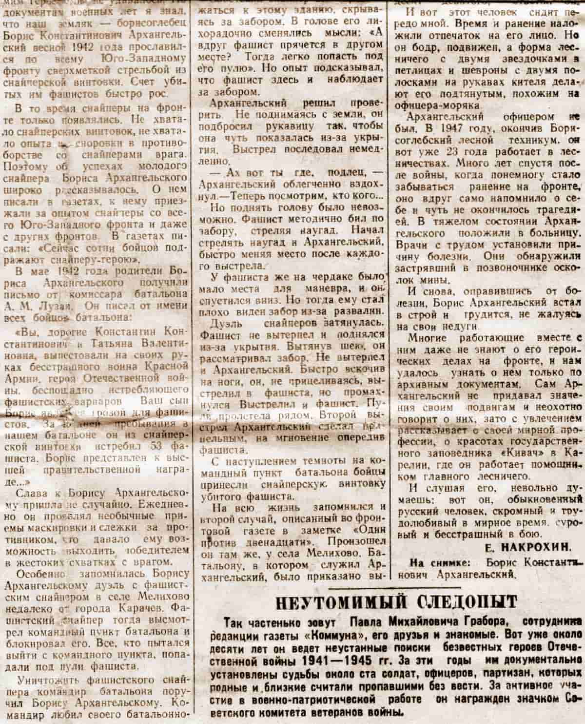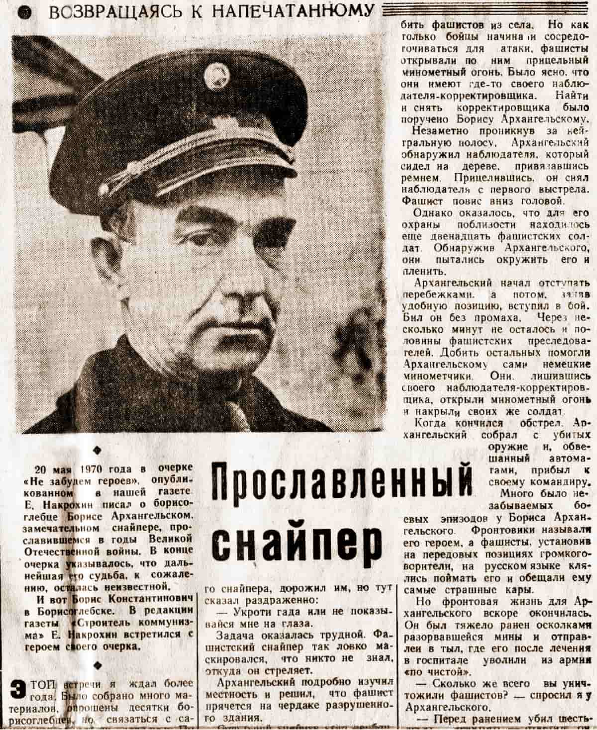 20 мая 1970 года в очерке «Не забудем героев», опубликованном в нашей газете, Е. Накрохин писал о борисоглебце Борисе Архангельском, замечательном снайпере, прославленном в годы Великой Отечественной войны. В конце очерка указывалось, что дальнейшая его судьба, к сожалению, осталась неизвестной.