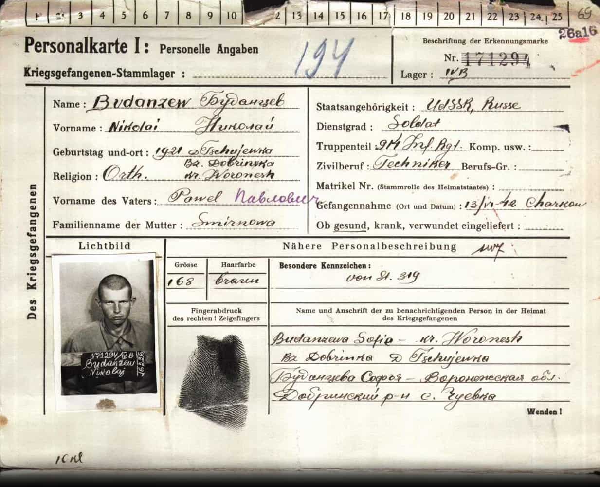 В персональной карте военнопленного Буданцева Николая Павловича приведены следующие сведения о пребывании в лагерях шталаг IV B, шталаг IV F, и о принудительных работах в период с августа 1942 по июль 1943 года: