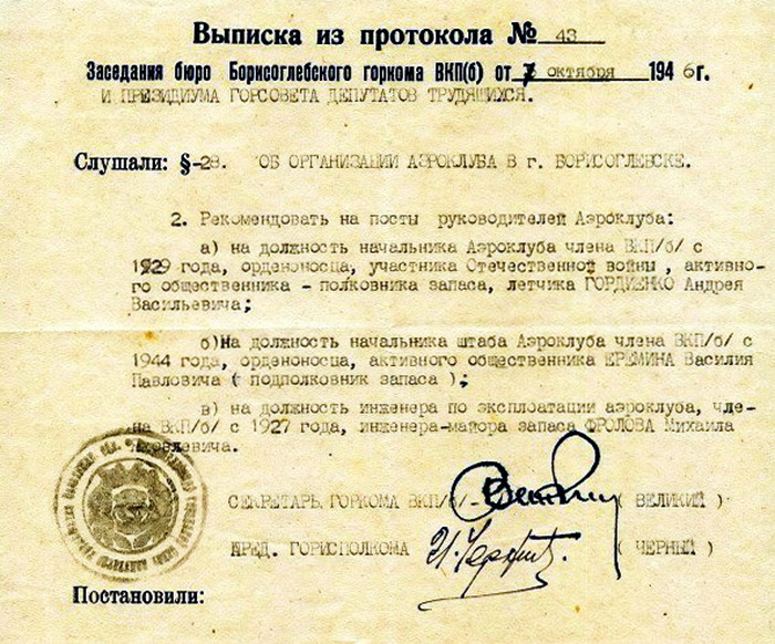 Решением бюро Борисоглебского горкома ВКП(б) и президиума Горсовета депутатов трудящихся 07.10.1946 (протокол № 43 заседания бюро ГК ВКП(б) и Президиума горсовета) рекомендован на пост начальника штаба Борисоглебского аэроклуба.