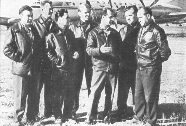 Группа летчиков-испытателей авиапромышленности. Слева направо: Ф. Бурцев (в 1941 г. окончил Борисоглебскую ВАШЛ), В. Комаров, Ю. Гарнаев, О. Гудков (в 1952 г. окончил Борисоглебское ВАУЛ), Л. Рыбиков, В. Плаксин, В. Васин.
