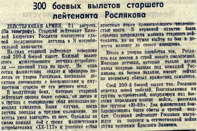 За время войны Росляков Николай Андреевич выполнил около 400 боевых вылетов, в которых сбил 5 самолётов противника лично и 6 в группе.