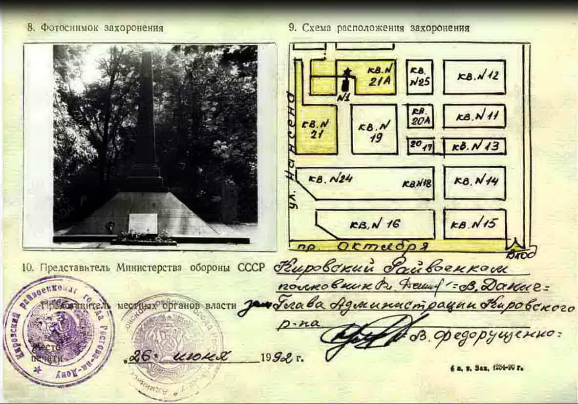 Перезахоронен в июле 1949 года на Братском кладбище г. Ростов-на-Дону, квартал 21.